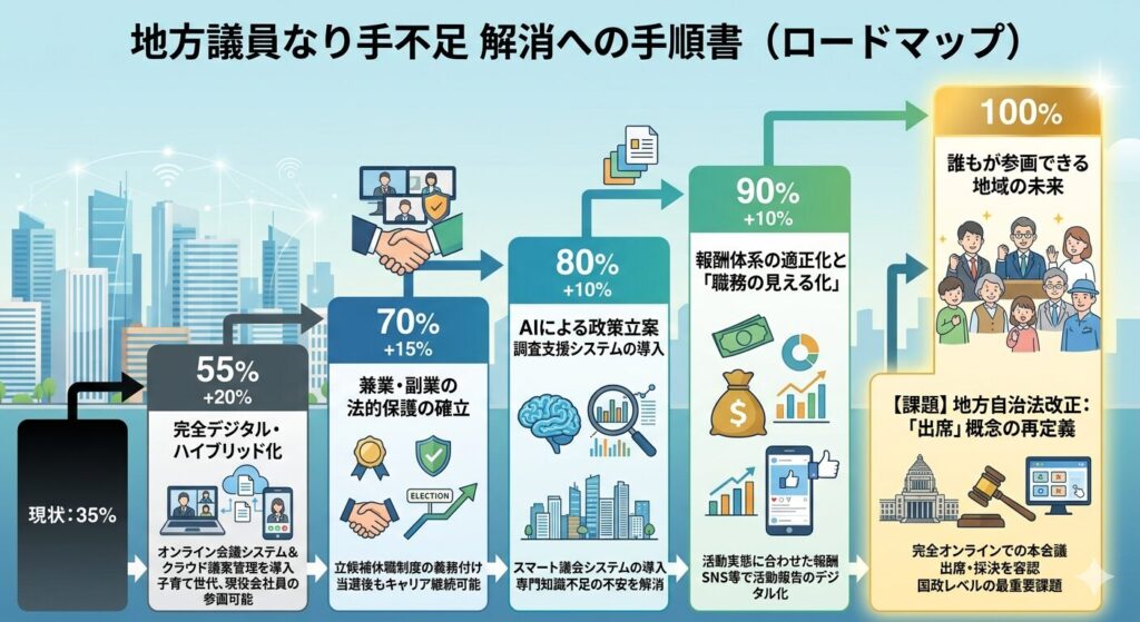 現在、日本の地方自治は「なり手不足」という静かな崩壊の危機に直面しています。この手順書は、現状の35%という地点から、誰もが地域の未来に参画できる100%の状態へ導くための具体的なロードマップです。物理的な壁を取り除き、心理的な距離を縮めることで、地方議会を「負担」から「誇りあるアップデート」の場へと変容させます。