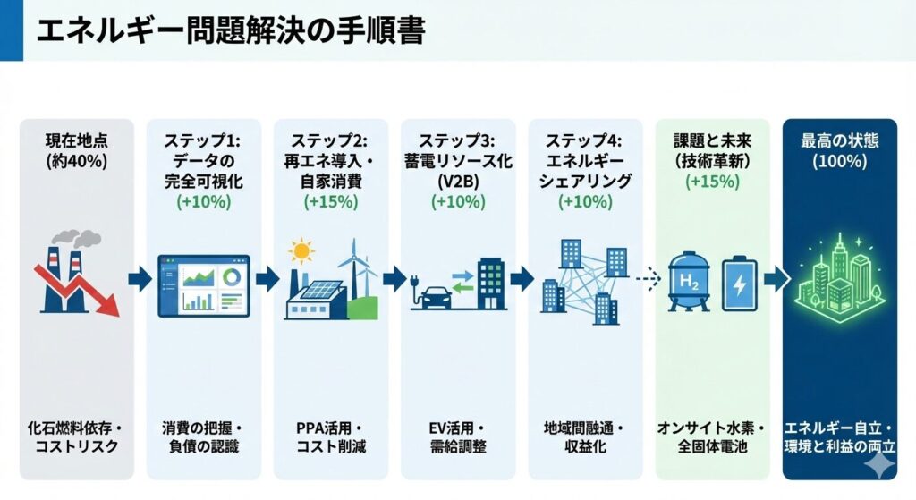 日本の企業が直面するエネルギー問題は、もはや単なるコストの問題ではなく、企業の「存続」を賭けた競争力の源泉です。2026年、排出量取引制度の本格化に伴い、化石燃料に依存し続けるリスクは極大化しています。本手順書は、現在の不透明な状況から、エネルギー自立を果たし、環境と利益を両立させる「最高の状態」へ至るためのロードマップです。
