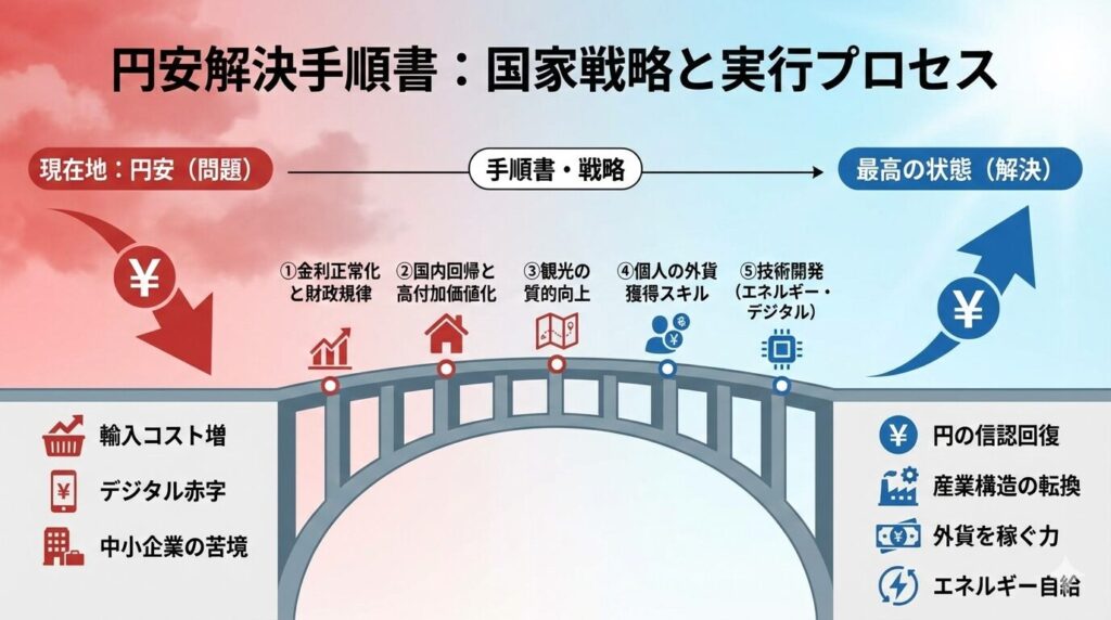 円安問題の本質は、単なる通貨価値の変動ではなく、日本の「エネルギー・食料・デジタルの外部依存」と「低付加価値な産業構造」が露呈した結果です。1ドル150円前後の水準は、輸入コスト増を通じて国民生活を圧迫しますが、一方で観光や輸出、製造業の国内回帰という巨大なチャンスももたらしています。 解決には、目先の為替介入だけでなく、日本経済を「外貨を稼ぎ、エネルギーを自給する強靭な構造」へとアップグレードする長期的アプローチが不可欠です。