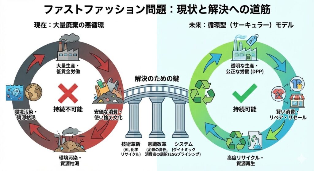 さらに、年間1,000億着以上が生産される一方で、その多くが短期間で廃棄され、チリのアタカマ砂漠やガーナの海岸には巨大な衣類の墓場が出現しています。この「大量生産・大量消費・大量廃棄」の線形モデルは、地球の資源的限界を突破しつつあります。現在、欧州を中心に法規制が強化され、企業には「売って終わり」ではない責任が求められています。本手順書は、この歪な構造を「循環型(サーキュラー)」へと再構築し、人権と環境を守りながらファッションを楽しむための具体的な道筋を示すものです。
