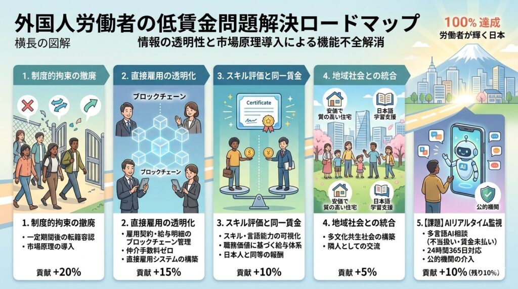 日本における外国人労働者の低賃金問題は、単なる経済的な格差ではなく、旧来の制度的拘束と仲介構造による「市場原理の機能不全」が本質です。このままでは労働力不足の解消どころか、国際的な信頼を失い、日本経済そのものが衰退するリスクを孕んでいます。本手順書は、情報の透明性を確保し、労働者が正当な対価を得て、日本社会の不可欠なパートナーとして輝くためのロードマップです。