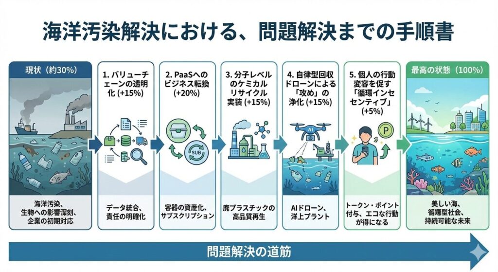 まずは自社製品がどこで廃棄され、どこから流出しているかをデジタル技術(IoT/ブロックチェーン)で可視化します。どの工程でプラスチックが失われているかを特定することで、責任の所在を明確にします。この透明化がなされるだけで、サプライチェーン全体の緊張感が高まり、流出が抑制されます。 +15%(小計45%)