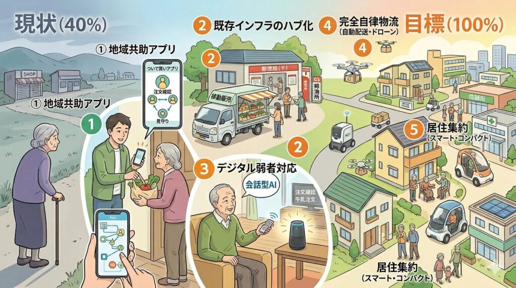買い物難民問題は、単に「モノが買えない」という消費の停滞にとどまらず、高齢者の健康悪化や社会的孤立を招く「生存権」に関わる深刻な課題です。人口減少に伴い、従来の商業モデルが崩壊する中で、私たちは「店舗が顧客を待つ」スタイルから、「コミュニティとテクノロジーが一体となってモノを届ける」スタイルへの再構築を求められています。この手順書は、現在地点の40%から、誰もが安心して暮らせる100%の状態へ導くための道筋を示します。
