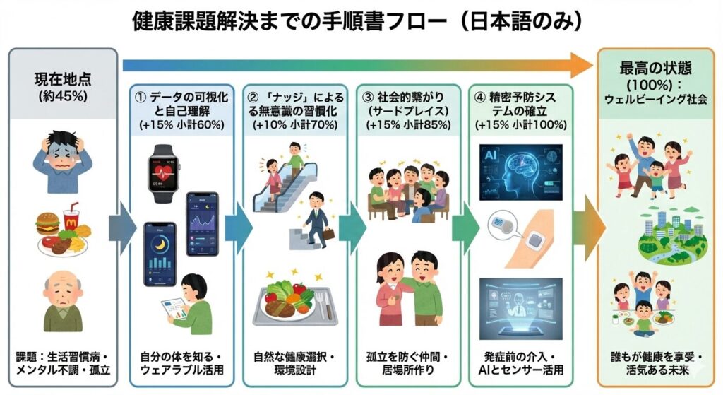 不足している科学技術の克服が必要です。 リアルタイムで血糖値やストレスホルモンを測定できる「非侵襲センサー」の普及と、それに基づいたパーソナルAIのアドバイスが受けられる社会インフラを構築します。これにより、発症前に「今は休むべき」といった具体的な介入が可能になります。 +15%(小計100%)