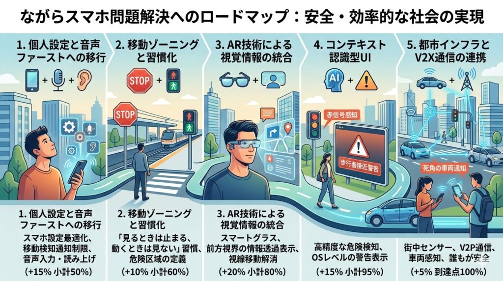歩きスマホや運転中のスマホ操作は、個人の注意力の問題として片付けられがちですが、その本質は「人間の認知限界」と「デバイスの没入性」の衝突にあります。この手順書は、個人の習慣改善からテクノロジーによる物理的な解決までを段階的に組み合わせ、事故のリスクを最小化し、安全で効率的な移動社会を実現するためのロードマップです。