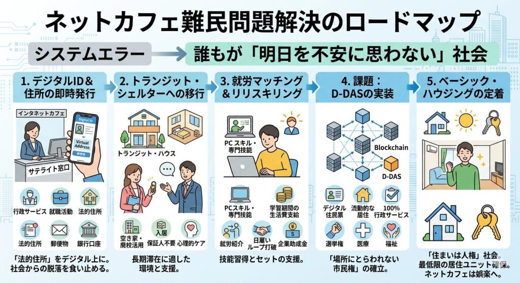 本手順書は、住居を喪失しネットカフェを拠点とせざるを得ない人々が、再び安定した生活基盤を構築し、社会との繋がりを取り戻すためのマイルストーンを示すものです。 この問題は個人の怠慢ではなく、硬直化した「住所・雇用・福祉」のシステムエラーに起因します。 デジタル技術と柔軟な居住支援を組み合わせることで、誰もが「明日を不安に思わない」社会の実現を目指します。
