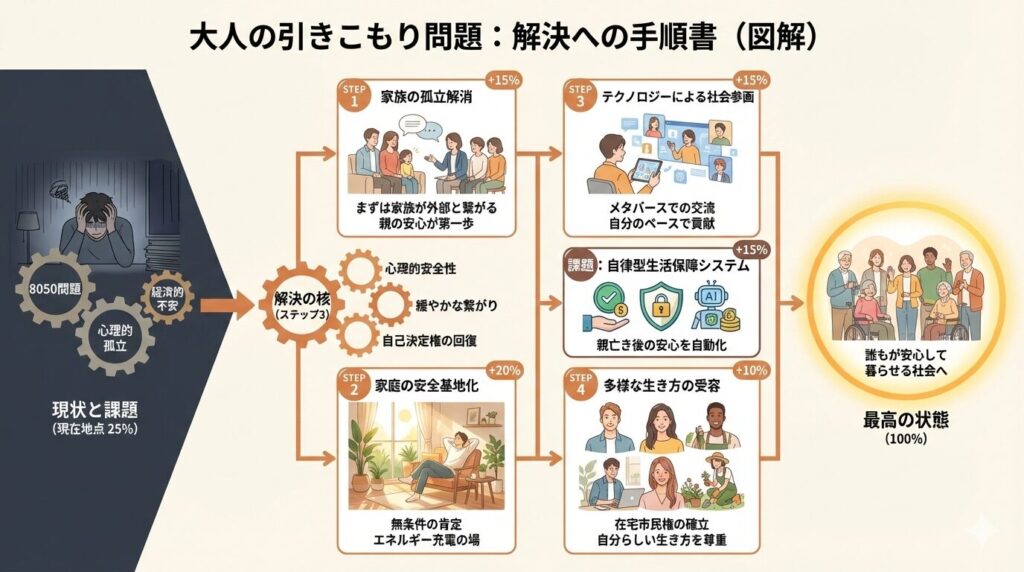 「働いているかどうか」ではなく「その人が穏やかに存在できているか」に価値を置く社会へのパラダイムシフトを目指します。在宅のまま市民としての権利を享受し、オンライン等で可能な範囲の貢献(相談相手、知見の発信など)を行う「在宅市民」としての居場所を確定させることで、問題は実質的な解決(100%の状態)へと到達します。 +10%(小計100%)