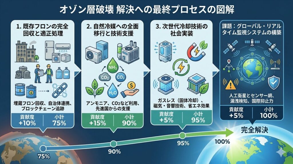 現在、古い建物や家電の中に残っている「埋蔵フロン」の回収が最大の課題です。自治体や業者が連携し、廃棄ルートを100%透明化します。ブロックチェーン技術を導入し、冷媒の製造から破壊までのライフサイクルを追跡することで、違法な大気放出を根絶します。この徹底により、回復速度を劇的に高めます。 +10% (小計75%)