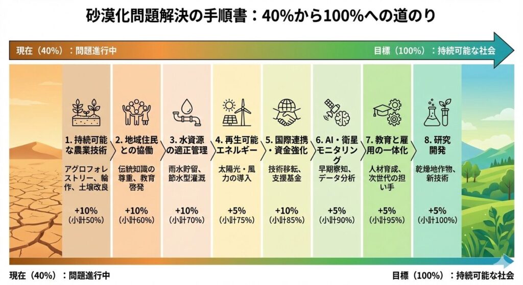 国際的な取り組みも進んでいますが、気候変動の影響と人口増加により、問題は今も進行中です。この手順書では、現在地点(40%)から最高の状態(100%)を目指すための具体的なステップを示します。