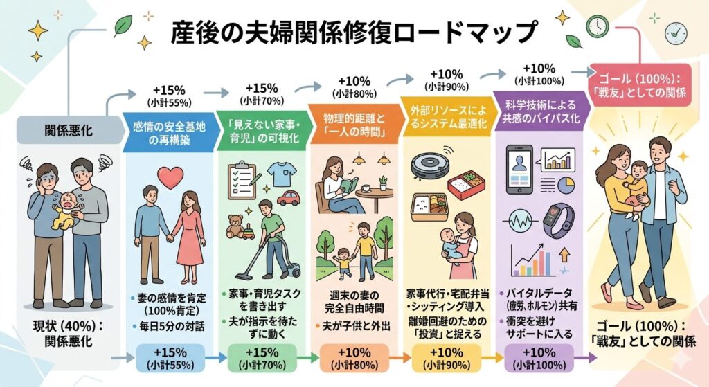 出産というライフイベントは、家族にとって最大の喜びであると同時に、夫婦関係における最大の危機でもあります。この問題の本質は、単なる家事分担の不備ではなく、激変する環境下での「孤立」と「共感の欠如」にあります。妻側は心身のダメージと孤独に耐え、夫側は変化に取り残される。このギャップを埋めるには、感情的な寄り添いと、物理的なシステム再構築の両輪が必要です。本手順書は、現在地点の40%から、共に歩む「戦友」としての100%を目指すためのロードマップです。