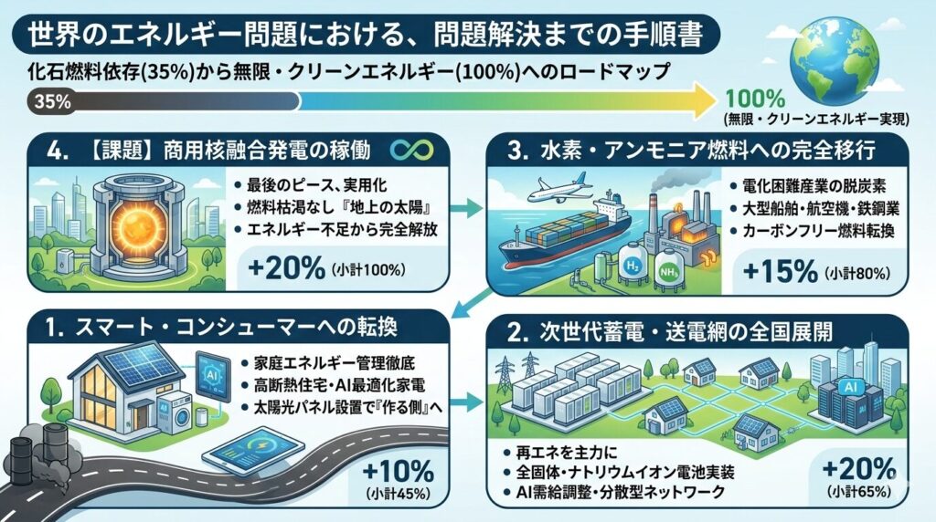 現在の世界は、化石燃料への依存から脱却できず、気候変動とエネルギー安全保障のジレンマに陥っています。現在地点は35%であり、これを100%(無限・クリーンエネルギーの実現)へ引き上げるには、技術革新と社会システムの抜本的な書き換えが必要です。本手順書は、個人の行動から国家レベルの技術投資までを統合したロードマップです。