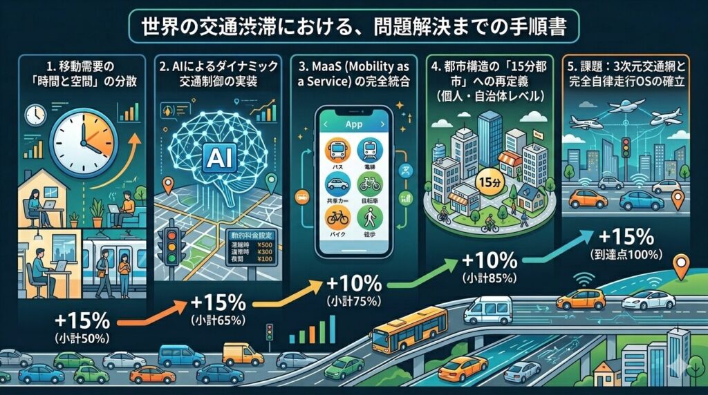 世界的な交通渋滞は、経済損失、環境破壊、そして人々の精神的疲弊を招く現代文明の「血栓」です。この手順書は、物理的なインフラ整備に頼る古いパラダイムを脱却し、デジタル技術と社会構造の変革によって、移動の自由と円滑さを取り戻すためのロードマップです。