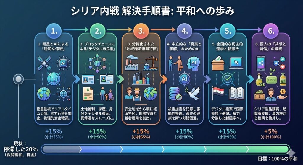 シリア内戦は、単なる一国内の権力闘争を超え、国際政治の縮図となってしまった悲劇です。10年以上にわたる争いで、人々の絆は引き裂かれ、街は瓦礫と化しました。この問題の解決には、政治的な妥協だけでなく、テクノロジーによる信頼の補完と、人道的な視点を最優先した段階的なアプローチが不可欠です。現在、戦闘の激しさは緩和されましたが、貧困という新たな敵が国民を苦しめています。本手順書は、この停滞した「20%」の状態から、誰もが安心して暮らせる「100%」の平和へと歩みを進めるための羅針盤として作成しました。