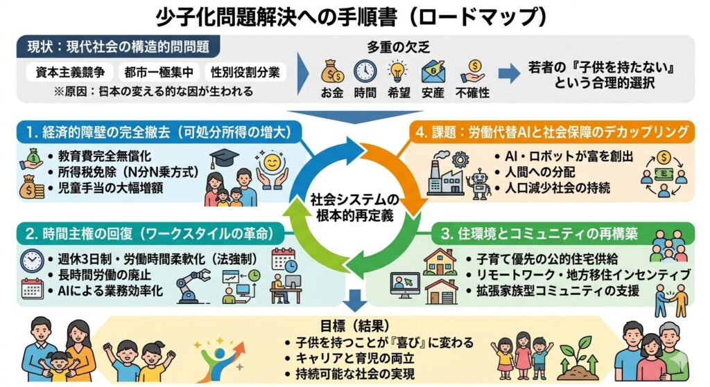 少子化問題の本質は、現代の社会構造(資本主義の過度な競争、都市部への一極集中、性別役割分業の名残)が、生物としての「次世代を残す」という本能的活動と致命的に乖離してしまったことにあります。 単なる「お金がない」だけでなく、「時間がない」「希望がない」「余裕がない」という多重の欠乏状態が、若者に「子供を持たない」という合理的な選択をさせています。この問題は、従来の家族観を前提とした対策では解決できず、社会のシステムを根本から再定義する必要があります。