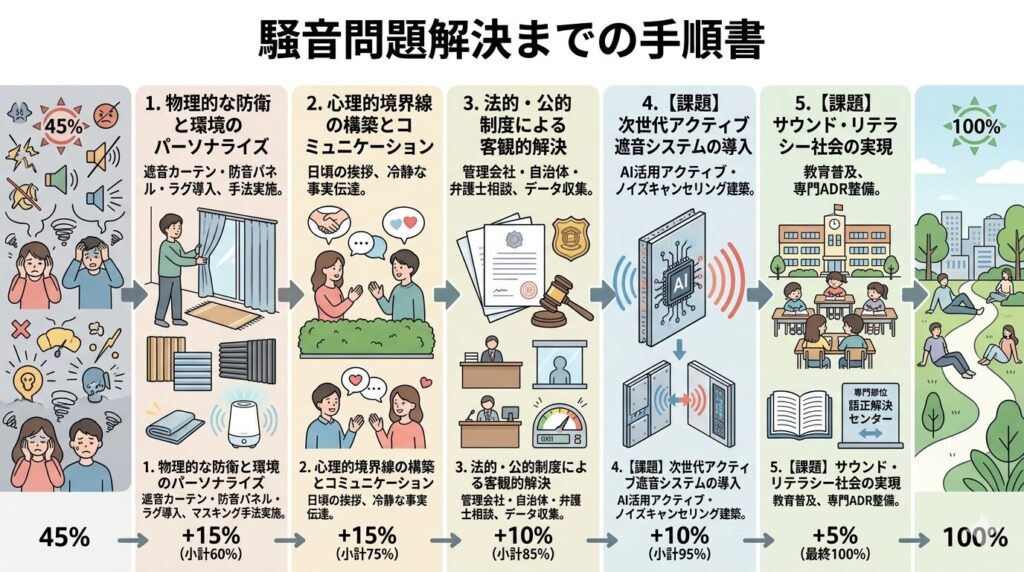 騒音問題は、単なる「音」の問題ではなく、空間の共有における「権利」と「感情」の衝突です。現代の過密社会では、無音を求めることは難しく、いかにして不快な音を制御し、心理的な平穏を保つかが鍵となります。この手順書では、物理的な対策から心理的な歩み寄り、そして未来の技術による解決までをロードマップ化し、現在地点の45%から100%へと近づくための具体的なステップを提示します。