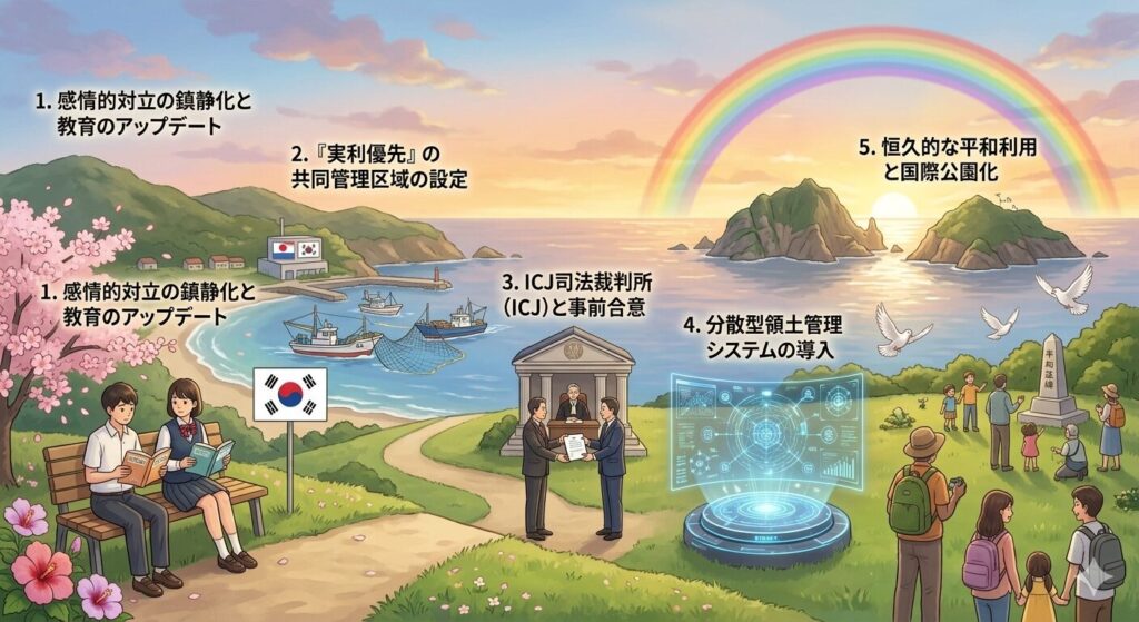 最終段階として、竹島を軍事拠点化しない「非武装中立地帯」とし、ユネスコ世界遺産や国際平和公園として登録します。科学調査や環境保護の拠点として世界に開放し、対立の地を「紛争解決の成功モデル」としてブランド化することで、100%の解決へと導きます。 +10%(小計100%)