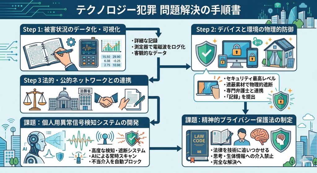 現代のテクノロジー犯罪は、個人のプライバシーを侵害するだけでなく、心身の健康や社会的な平穏を脅かす重大な課題です。本手順書は、見えない脅威を「可視化」し、技術と法の両面から自己を防衛し、最終的に誰もが安全に暮らせる社会を実現するための具体的なステップを示します。