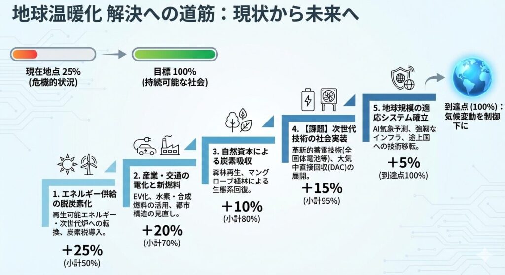地球温暖化は、産業革命以降の化石燃料依存が生んだ「文明の副産物」です。現在の1.44°C上昇という状況は、人類が過去に経験したことのない未知の領域への入り口です。しかし、これは単なる危機の回避ではなく、エネルギー革命を通じた「新しい豊かさ」への転換点でもあります。本手順書は、現在地点25%から、気候変動を制御下に置く100%の状態へ至るための具体的な道筋を示します。