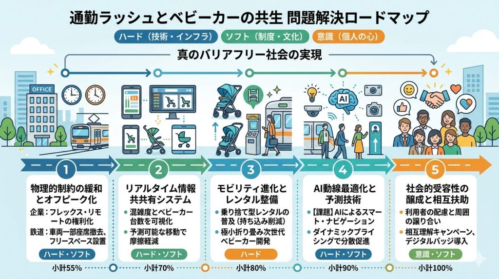 最終的な解決は、ハード面だけでなく「心」の持ちように帰結します。ベビーカー利用者は周囲への配慮(声掛けや操作)を忘れず、周囲は「社会の宝」を守る意識でスペースを譲ります。この相互理解を促すキャンペーンと、困っている時に助け合えるデジタルバッジ等の導入により、精神的な壁を取り払います。 +10%(小計100%)